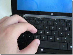 My first step was to get rid of the default installation of Windows XP in favor of an installation of windows 7, shown here. Also I have depicted the relative size of the keyboard to my fingers and hands. While the keys are smaller than standard, they are big enough that I can type comfortably without a long training period on the new keyboard. My one complaint of the keyboard is the location of the Page Up, Page Down, Home and End keys. They are alternate keys of the Up, Down, Left, and Right keys respectively. (Meaning that the function key needs to be pressed in order to perform these key functions.) Maybe this is pretty standard from a laptop perspective, but I think it’s worth mentioning since I use these keys quite a bit when web browsing, especially since I in general prefer to use the keyboard rather than using the touch pad for web browsing use.